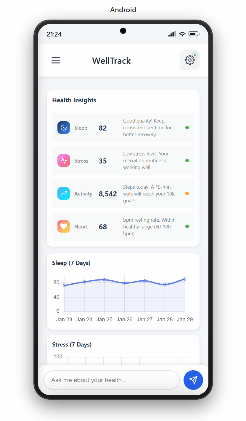 I developed a cross-platform health monitoring application built for the WearLife/SamenGezond project, available on iOS, Android, desktop, and web. The platform features user registration and authentication, personalized health service selection, and wearable device integration (e.g., Garmin, Fitbit). It visualizes longitudinal health metrics including physical activity, sleep quality, and stress levels, through interactive dashboards. A locally deployed LLM-powered conversational agent is integrated, enabling users to query their personal health data and receive tailored wellness recommendations in a privacy-preserving manner.